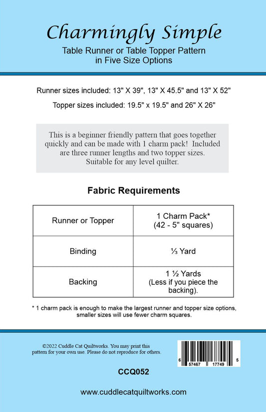 Charmingly Simple Table Runner & Topper Pattern for Charm Squares - Digital Pattern - Cuddle Cat Quiltworks CCQ052