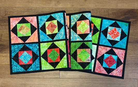 Stacked Squares Batik Table Runner in Green Blue Black and Red 18" X 52"