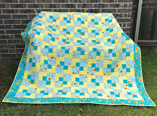 Blue Gray Teal and Yellow Patchwork Baby or Toddler Quilt